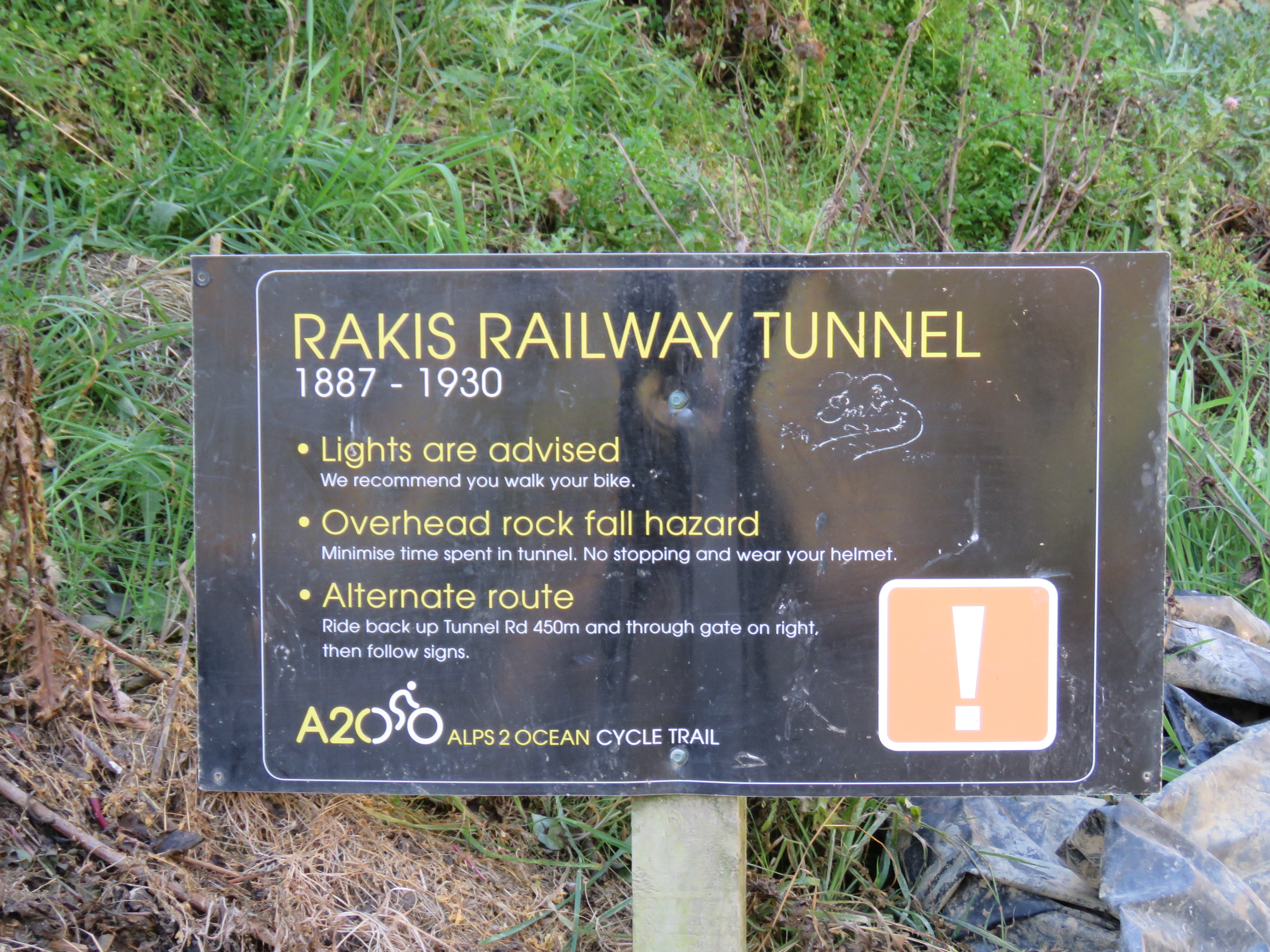 At the western portal is a small Alps to Ocean sign with the name of the railway tunnel, its years of service and due to the nature of the tunnel that lights are recommended and that there is an overhead rock fall hazard.